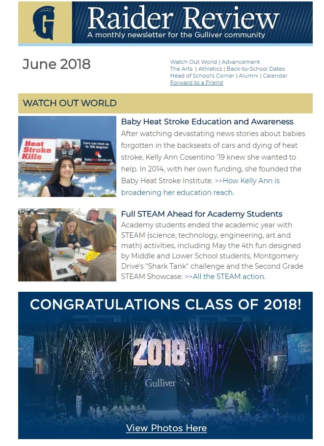 /This K-12 independent school wanted to move from a quarterly PDF newsletter to a monthly HTML email. We designed and created Raider Review using Gulliver's existing content management system, Finalsite, and its built-in newsletter creator, eNotify. Each month, we edited all of the stories, selected and cropped photos, and created the newsletter in eNotify.